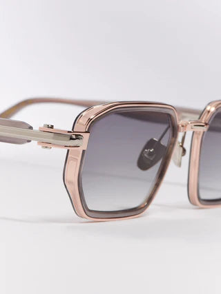 La monture présente un pont projeté, où les plaquettes de nez en titane sont fixées par une extension métallique.Les branches disposent de manchons en acétate prolongeant harmonieusement la structure jusqu’à un embout métallique, conçu comme son prolongement naturel. Travaillées avec des jeux d’épaisseurs et délicatement striées, elles renforcent le caractère affirmé du modèle.